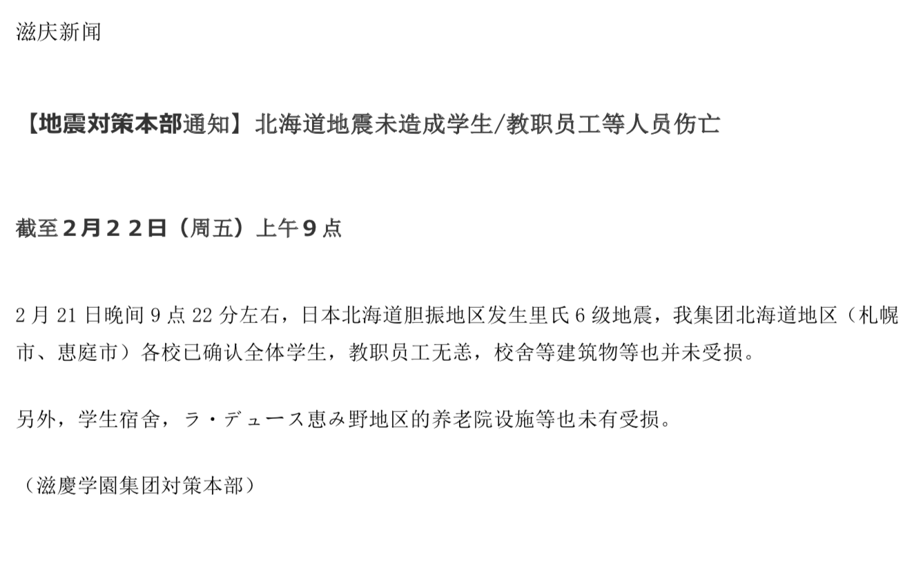 緊急通知!【地震対策本部通知】北海道地震未造成學(xué)生/教職員工等人員傷亡