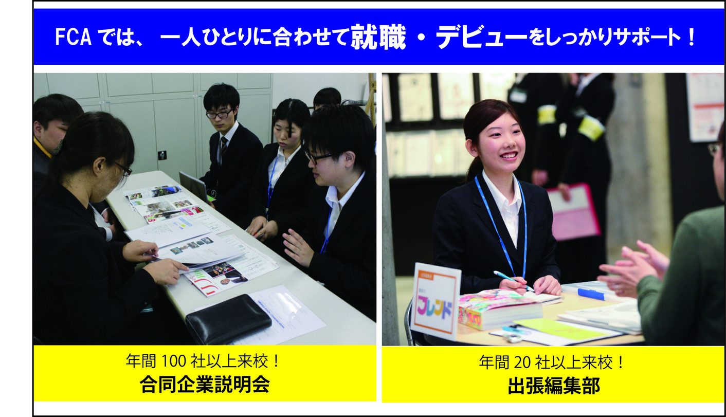 每年超過100家公司來校,開展企業(yè)說明會以及進行作品指導(dǎo)的合同企業(yè)說明會。這是得到內(nèi)定機會的重要機會。出道專業(yè)還舉行出差編輯部,是在學(xué)期間得以出道以及成為重要擔(dān)當(dāng)角色的重要機會。
