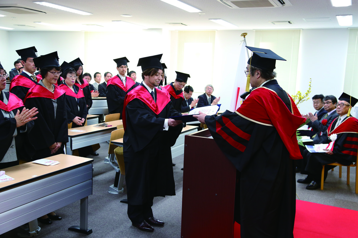 在學(xué)位辦法儀式時(shí),著碩士袍和帽,被授予碩士稱號(hào)。邊工作邊學(xué)習(xí)通過2年的努力得到回報(bào)的瞬間。
